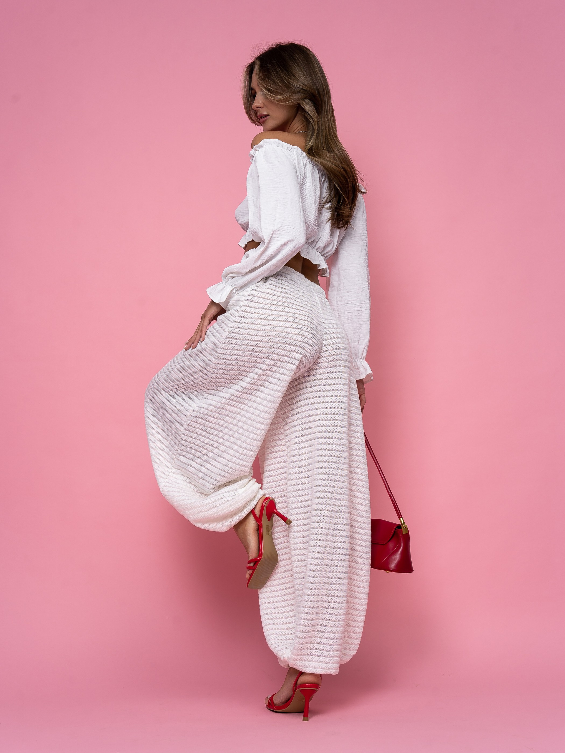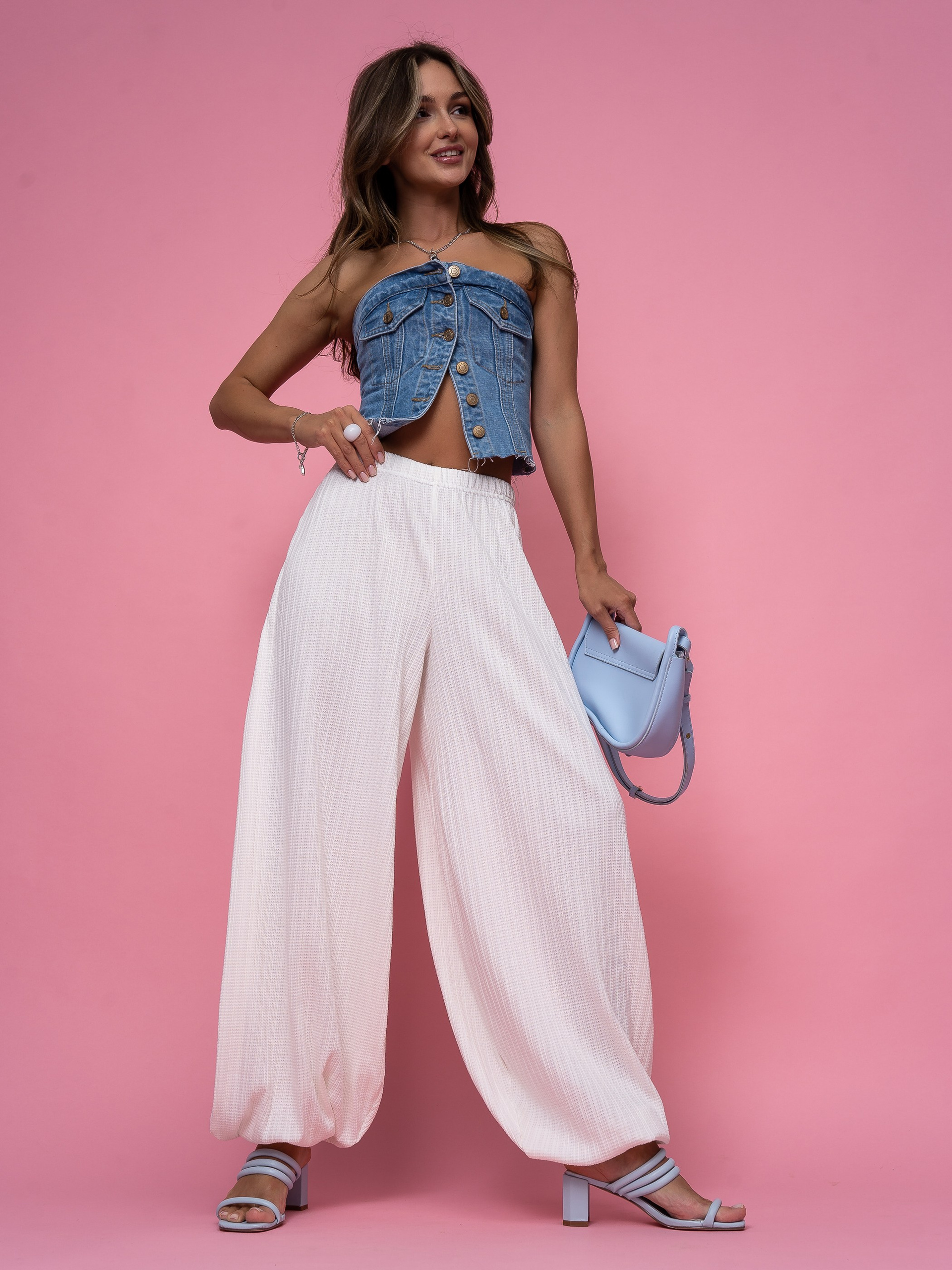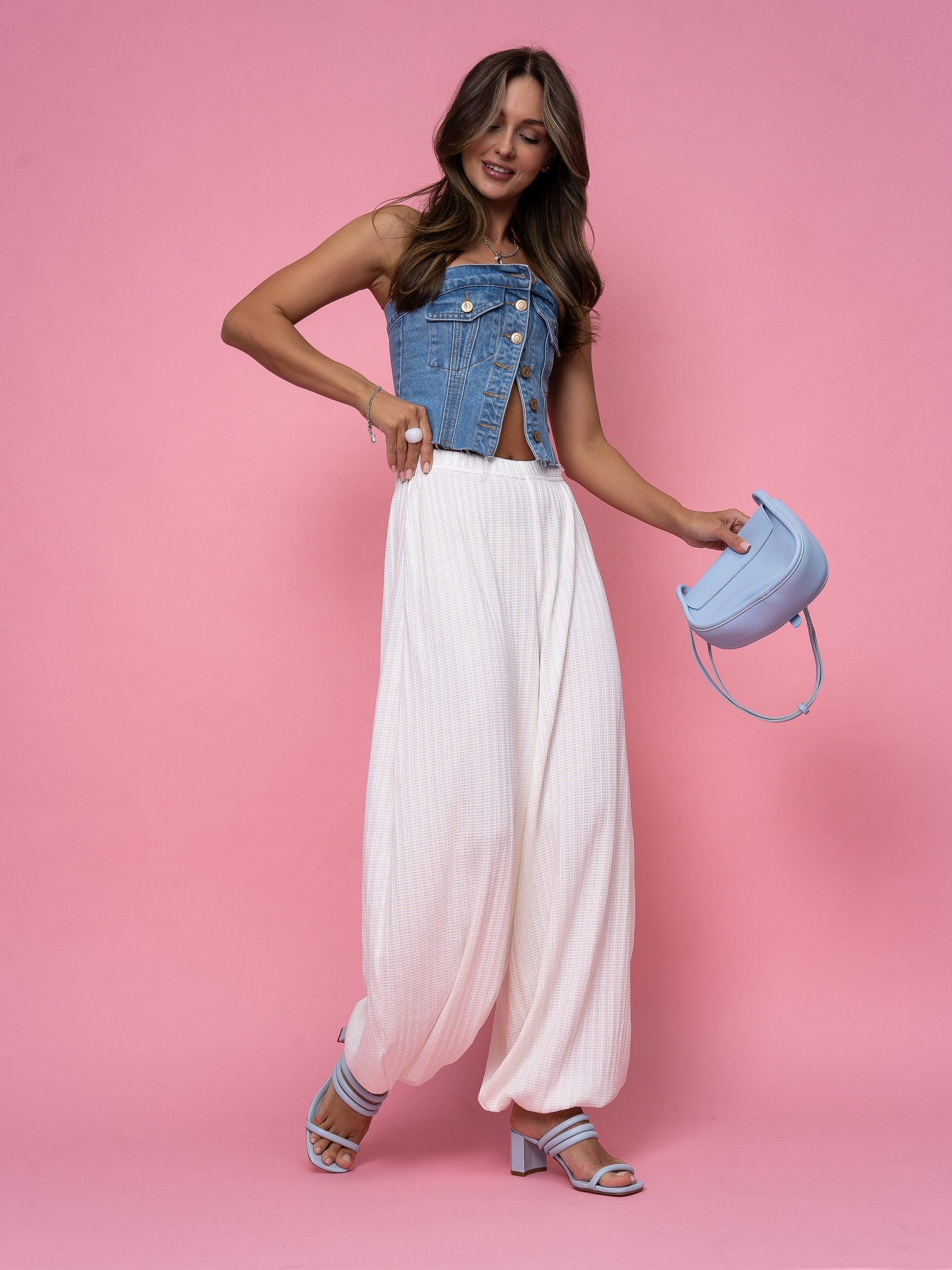 В этом проекте мы снимали белые брюки-алладины для бренда женской одежды. Модель актуальна для летнего сезона, поэтому важно было не просто показать изделие, а подать его в настроении, которое поддерживает сезонный спрос.