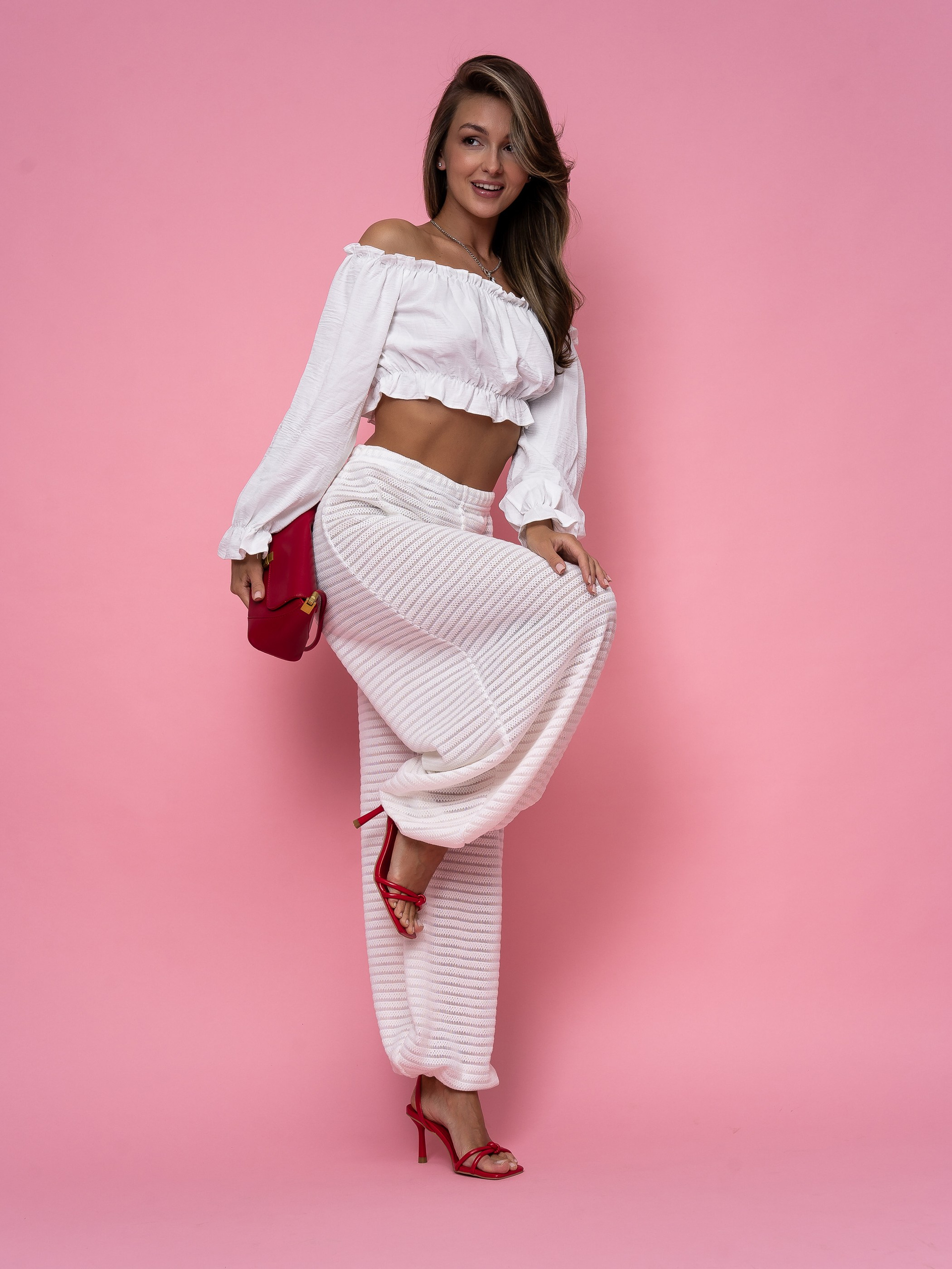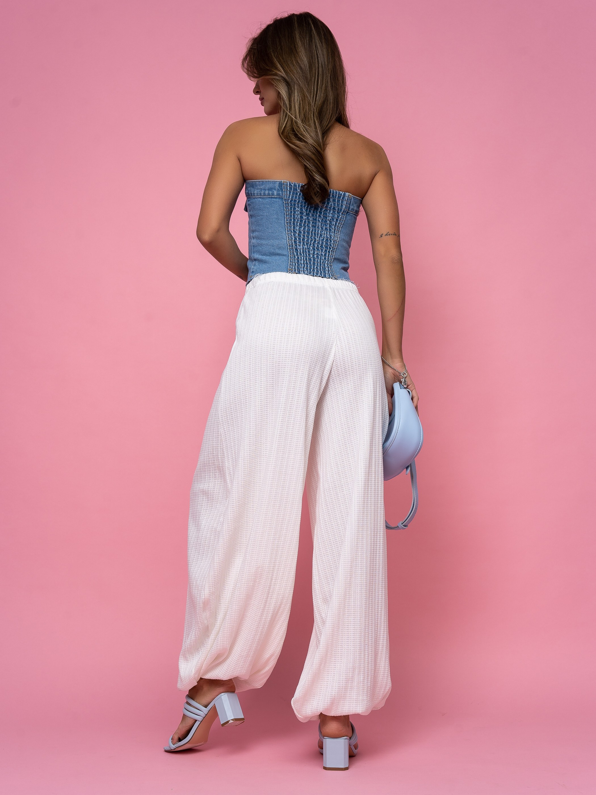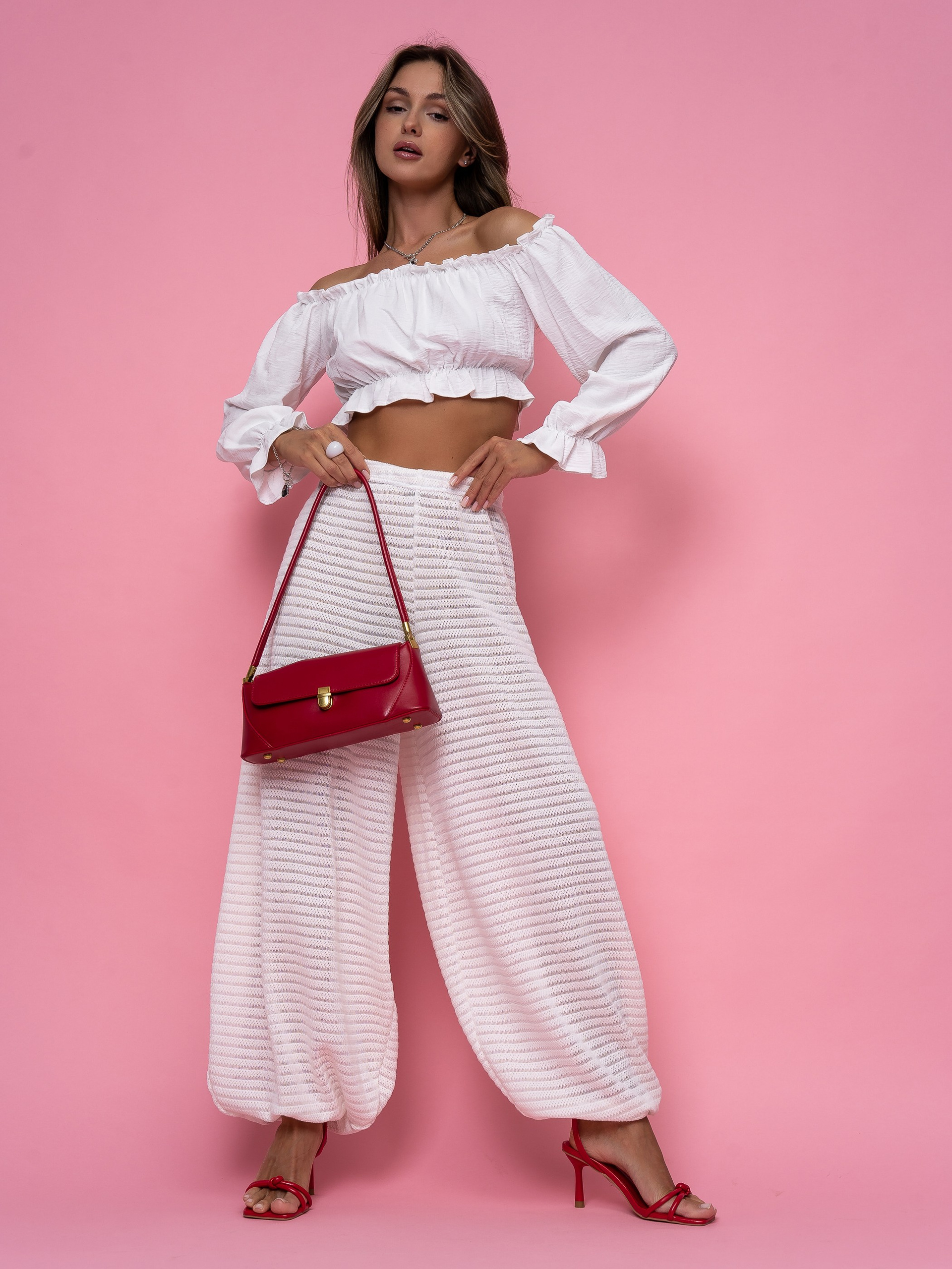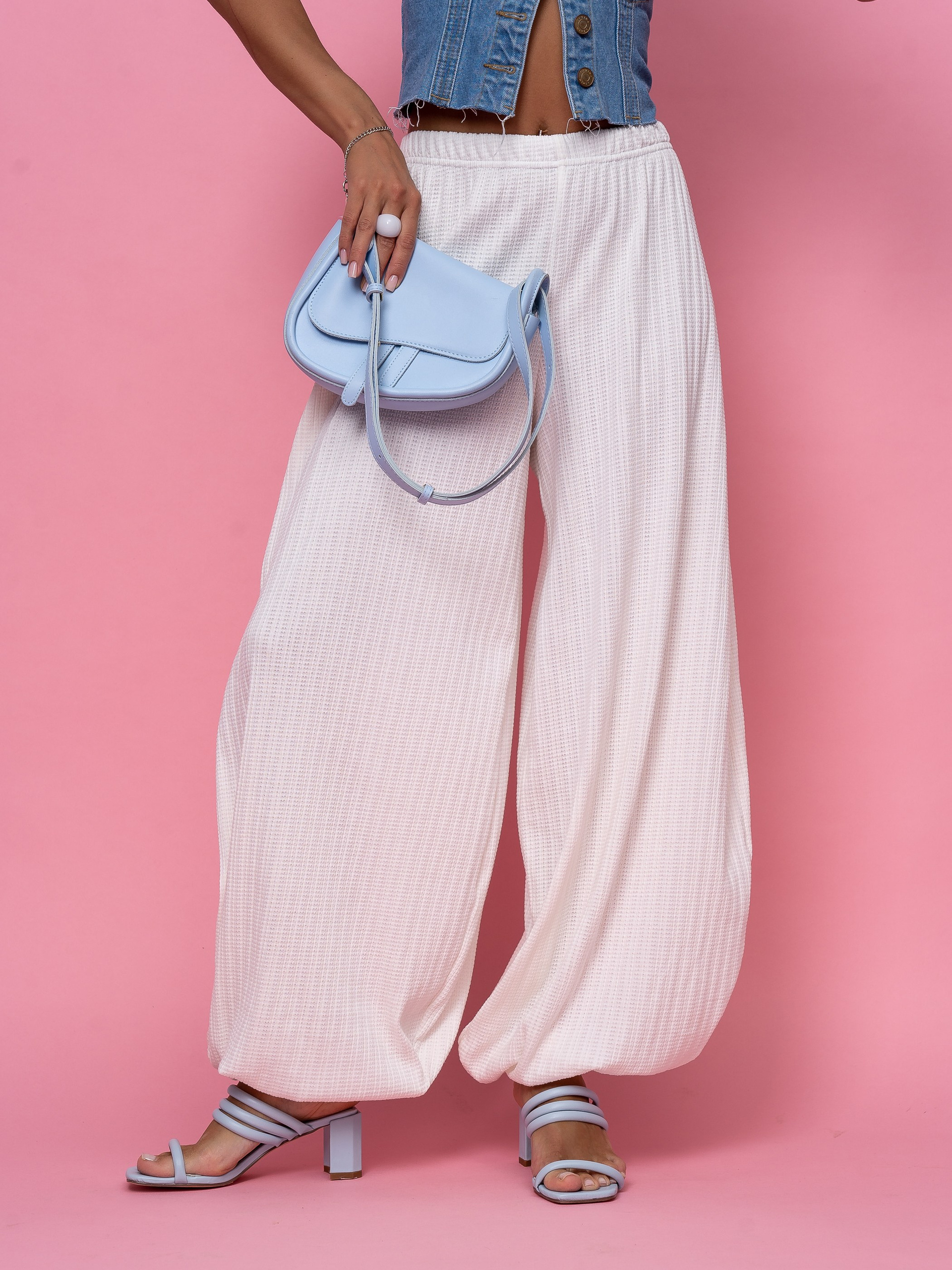 В этом проекте мы снимали белые брюки-алладины для бренда женской одежды. Модель актуальна для летнего сезона, поэтому важно было не просто показать изделие, а подать его в настроении, которое поддерживает сезонный спрос.