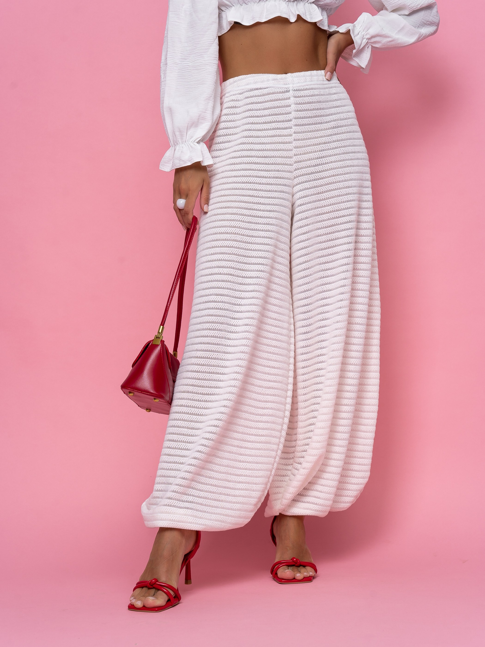 Показать белые брюки так, чтобы они оставались визуально легкими, но при этом хорошо читались в кадре: были видны форма, посадка, объем и фактура ткани.